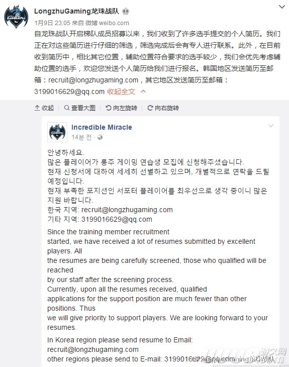 变身成豪华战舰的龙珠战队似乎还不满足,突然抛出了全球招募队员的消息,公告以中韩英三种语言发布,一时掀起舆论热潮,外界纷纷猜测,龙珠打算成为LCK赛区第一支拥有外援的战队?