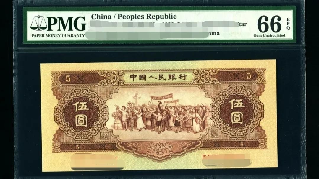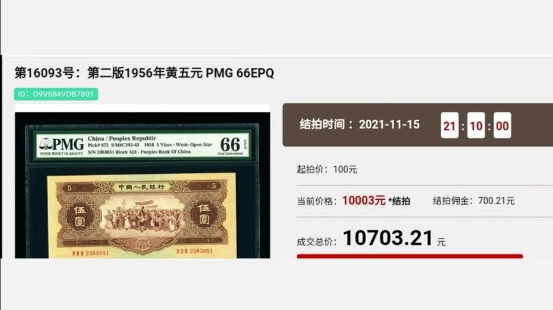 在2021年11月份左右,就有一张PMG评级66分的“黄五元”拍出!