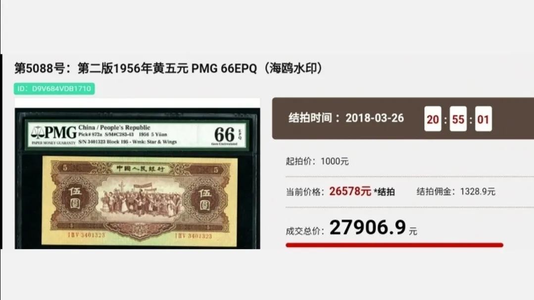 在2018年3月份左右,就有一张PMG评级66分的“黄五元”拍出!