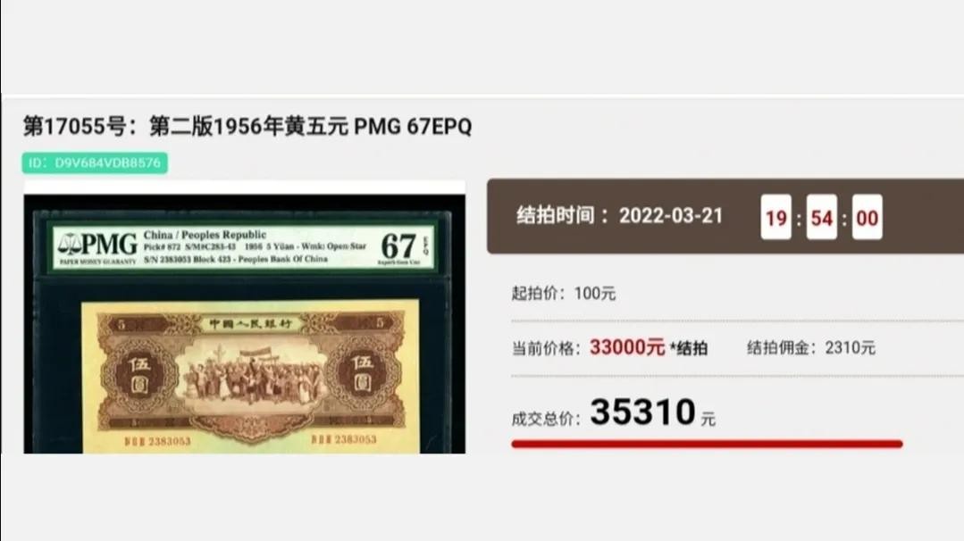 在2022年3月份左右,就有一张PMG评级67分的“黄五元”拍出!