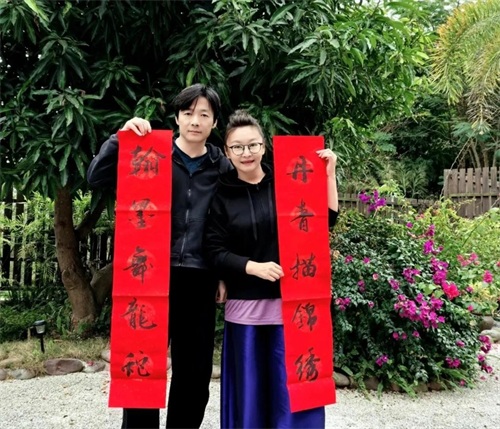 值得注意的是,夫妻俩手持一副对联。其中,祖峰手上的对联是“翰墨舞龙蛇”,刘天池手上的对联是“丹青描锦绣”。