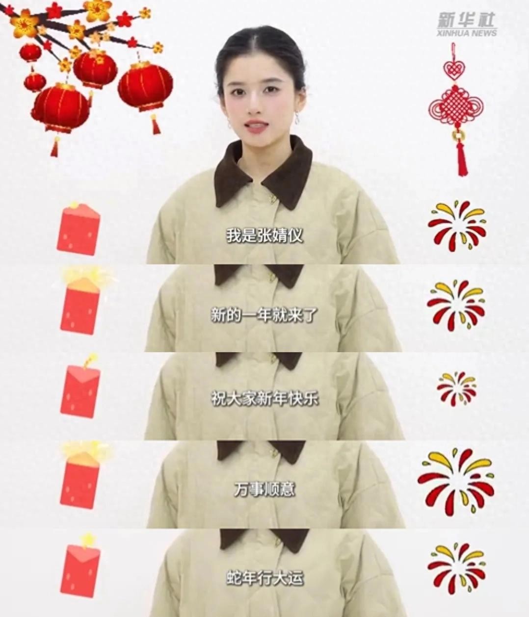 比如张婧仪,她出现在新华社官微发布的视频里。她说“在新的一年就来了,祝大家新年快乐,万事顺意,蛇年大吉。”