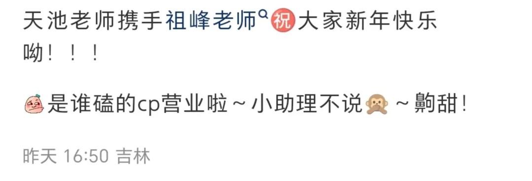 昨天(1月27日),刘天池官方账号发文称,天池老师携手祖峰老师祝大家新年快乐喲,还分享了一张照片。