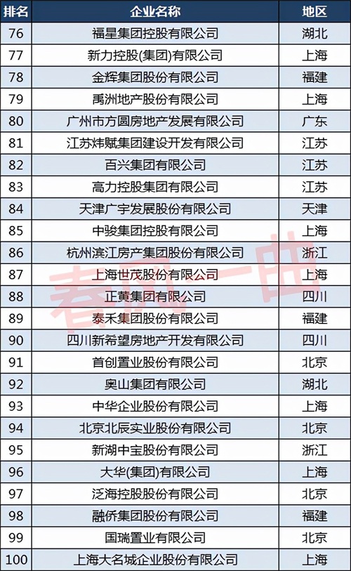 建业地产股份有限公司排名第75位,福星集团控股有限公司排名第76位;