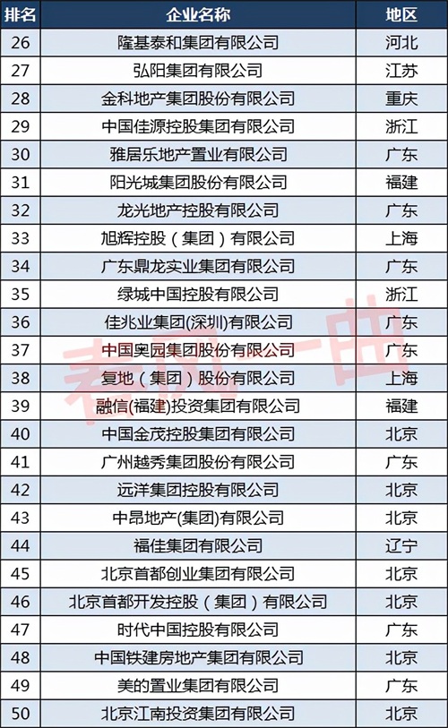 金地集团股份有限公司排名第25位,隆基泰和集团有限公司排名第26位;