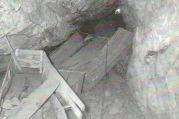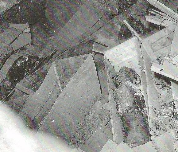 ▲山西大同煤峪口南沟万人坑B洞最下层棺木散乱的情况