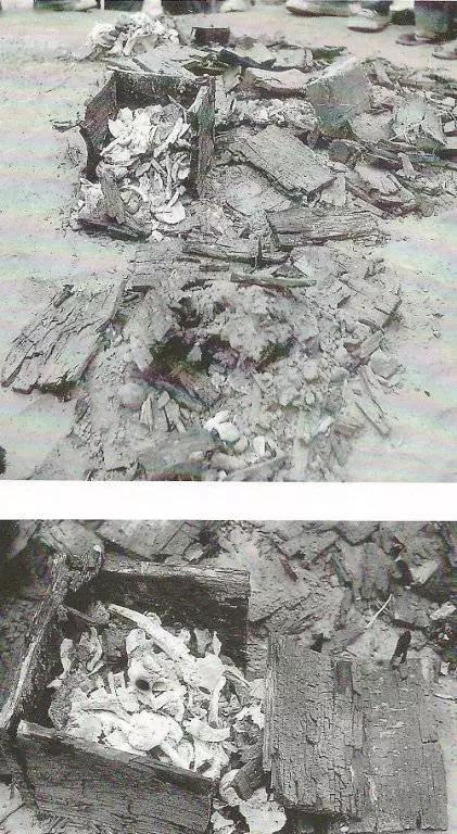 ▲从山西大同忻州矿杨树湾发掘出来的骨灰箱,箱内满载残骨碎块