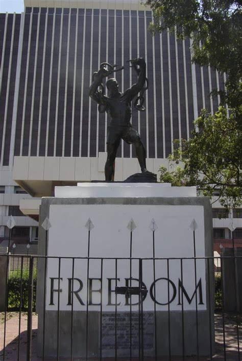 赞比亚首都卢萨卡市中心政府机关的正面竖立着赞比亚自由女神像。艺术品描绘了一个摆脱束缚的人,代表了赞比亚人推翻殖民主义束缚时所面临的斗争。现在,它已成为赞比亚的有力象征。