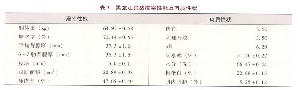 据 2007 年黑龙江省备牧兽医局在兰西县民猪保种场对 20 头民猪的育肥性能测定肥育期平均日增重 (507.05 ±2.00)g,料重比4.11 ±0.03。20 头民猪于249 日龄屠宰,率前活重90.03kg,其屠宰性能及肉质性状见表 3。