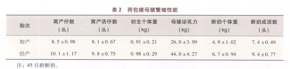 据2005 年辽宁省家畜家禽遗传资源保存利用中心在辽宁省荷包猪原种场和建昌荷包猪保种场的调查测定,荷包猪公猪135 日龄,母猪90 日龄;性成熟公猪 240 日龄,母猪210 日龄初配。母猪发情周期 18 ~25 天,妊娠期 112 ~116 天。在比较粗放的饲养管理条件下,对8 个生产周期 199 头初产母猪和 175 胎次经产母猪的繁殖性能统计,结果见表 2