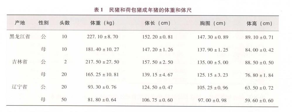 据 2007 年黑龙江省畜牧兽医局对兰西县民猪保种场和吉林省畜牧总站对长岭县中型民猪的调查,以及辽宁省家畜家禽遗传资源保存利用中心 2005 年对荷包猪保种场的调查,民猪成年猪的体重和体尺见表1。与《中国猪品种志》所记载的 70 年代数据成年民猪公猪体重 195kg、母猪 151kg 比较,中型民猪的体重略有增加。