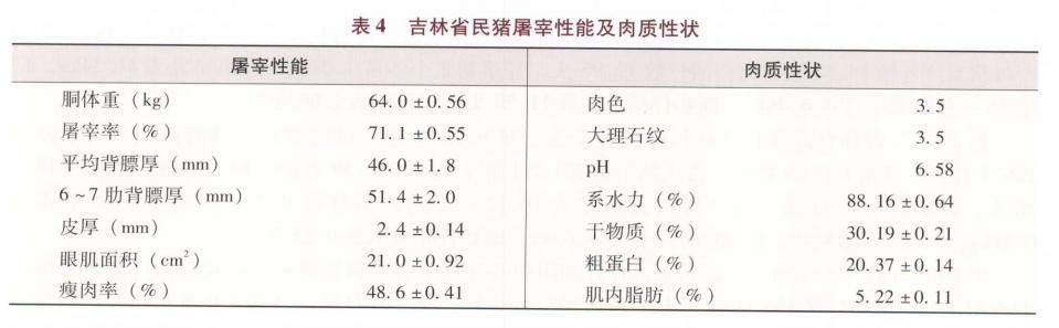 据2007 年吉林省畜牧总站在长岭县对 18 头民猪的屠案性能测定: 240 日龄育肥猪前活重90kg。对其中8 头民猪的肉质性状进行了测定,肉质良好,无 PSE 和 DFD 肉,肌纤维直径 (68.89 +0.52)um,见表4。