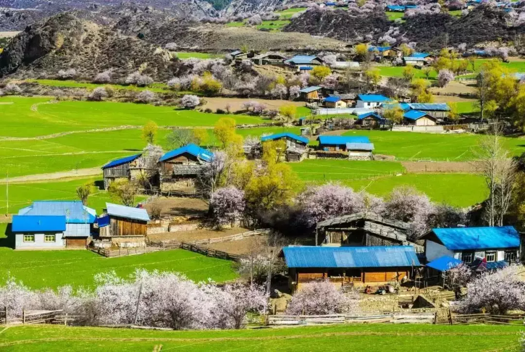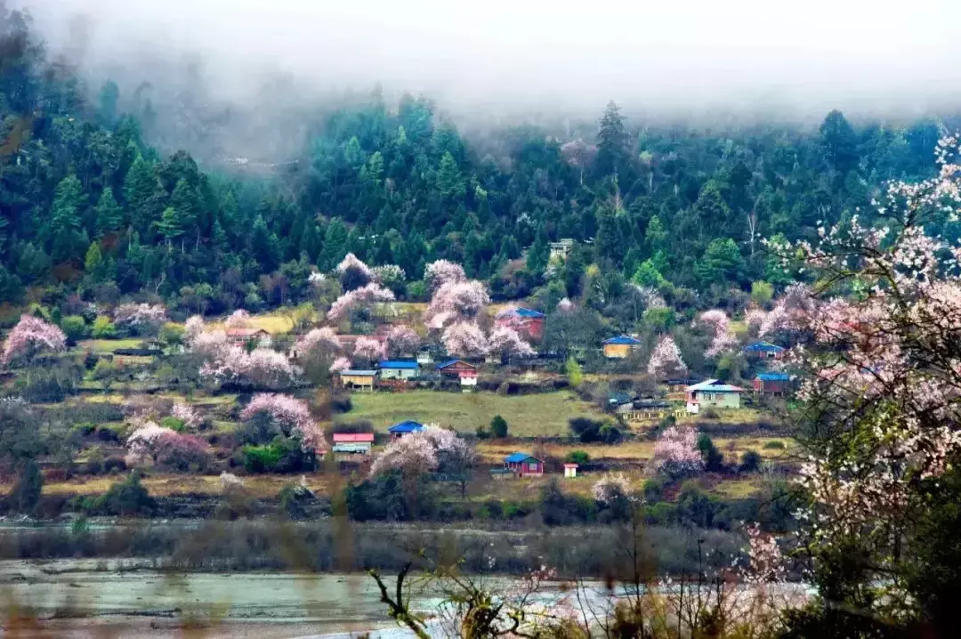 林芝的桃花以壮阔取胜,尼洋河畔的蓝是最好的背景,还有那些星罗棋布的藏式民居,也是花海中最好的点缀。