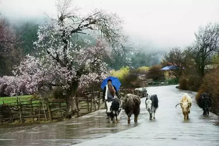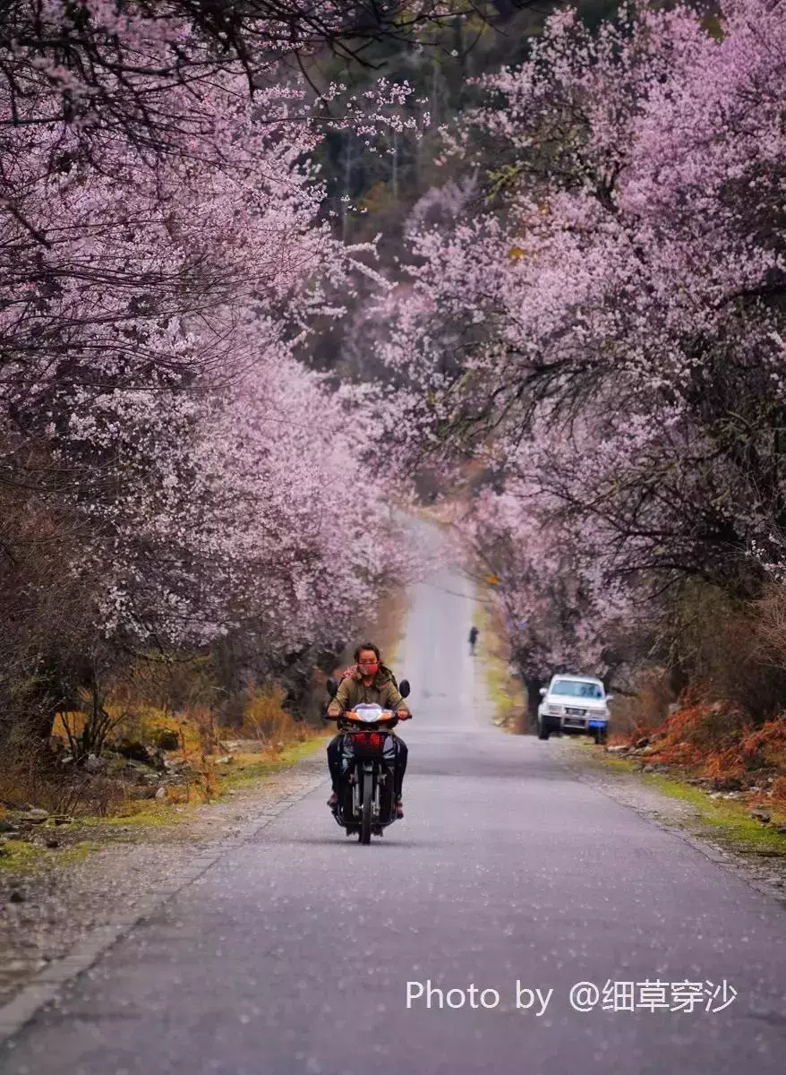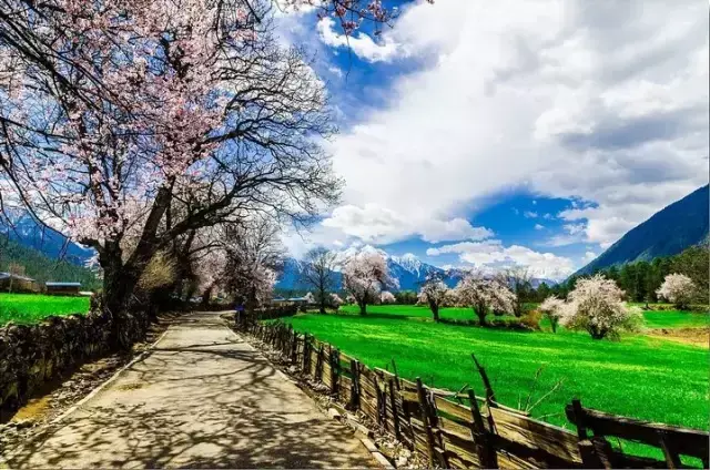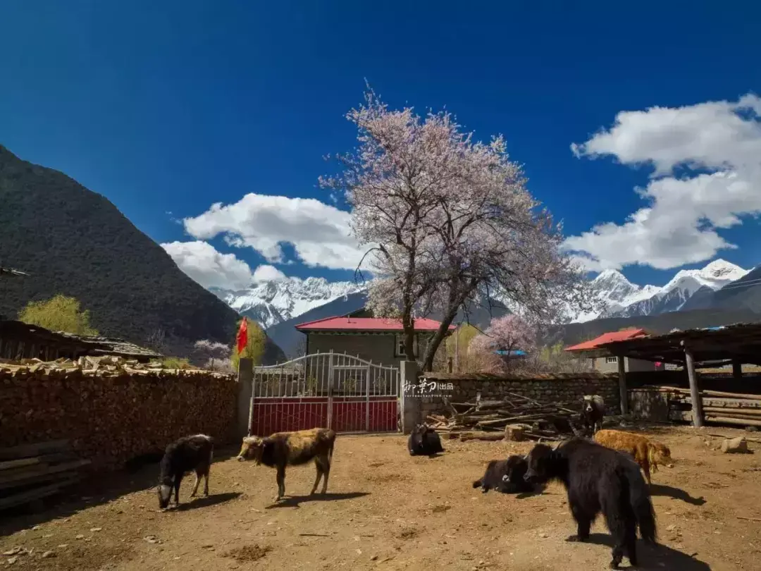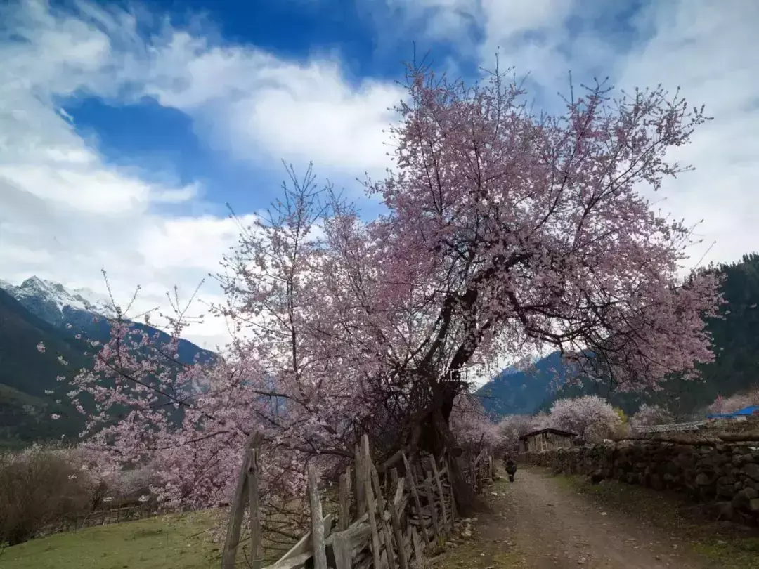 雪山、草甸、河水和密集的桃花,密密匝匝的桃林间可以闻花香,听花语,拍花景,晒花照。