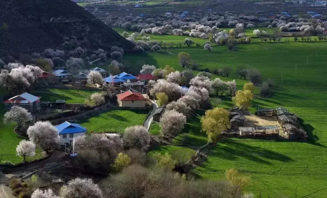 桃花沟靠近嘎拉村附近,沿着尼洋河畔两侧的田园和山丘上,有大片密集的桃花盛开,一簇簇装点在碧绿草甸上,风光醉人。
