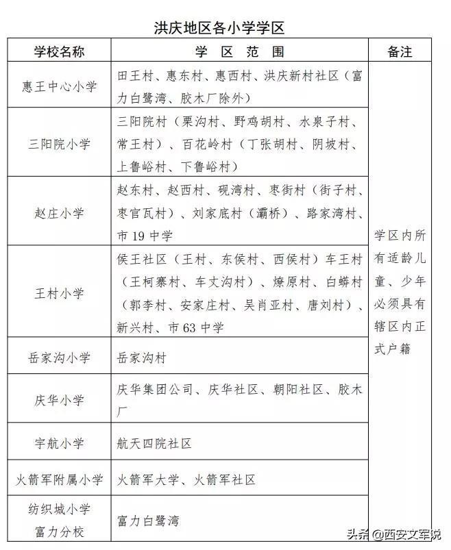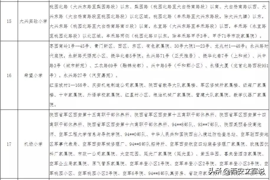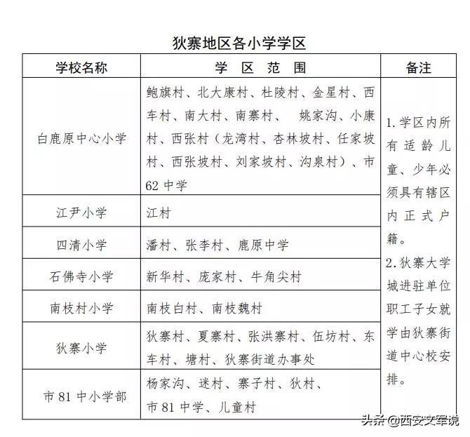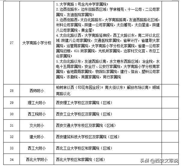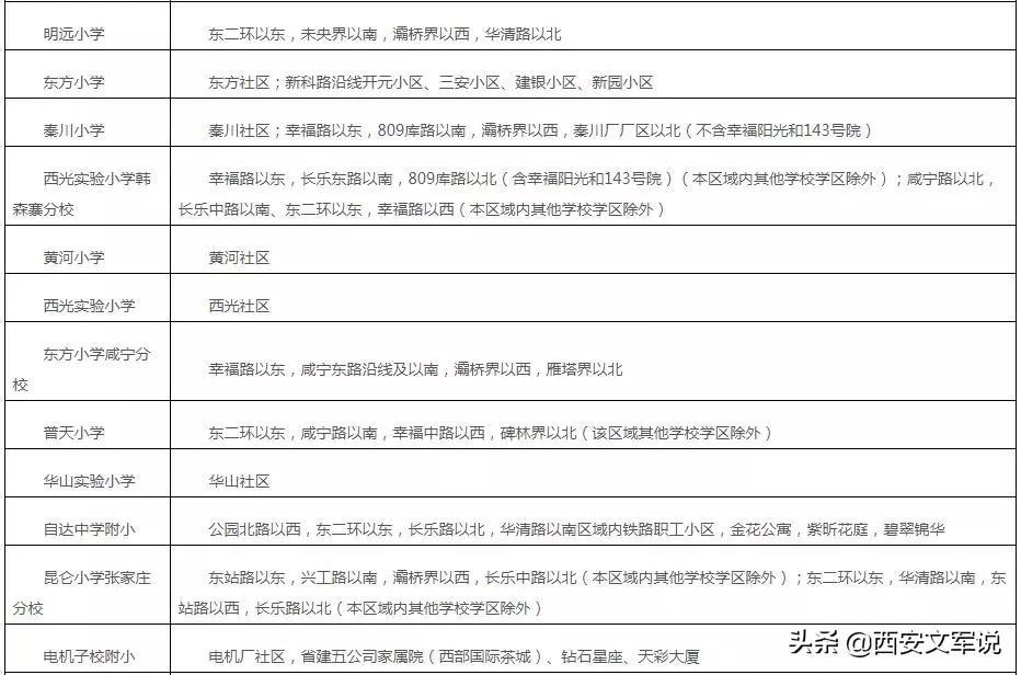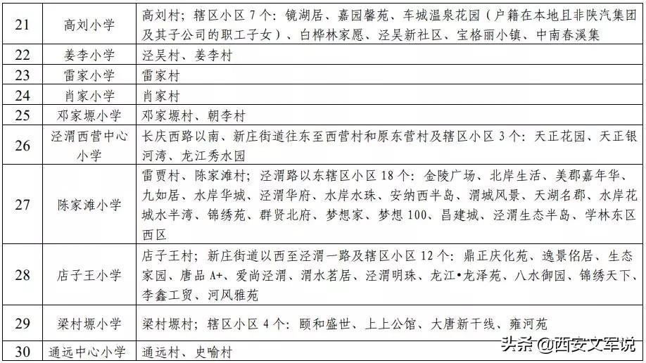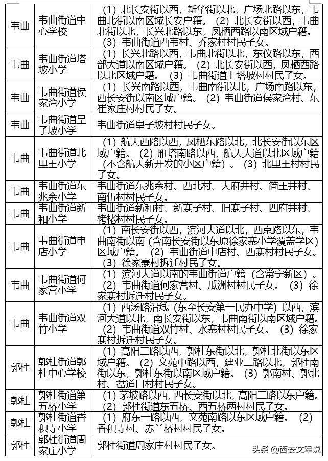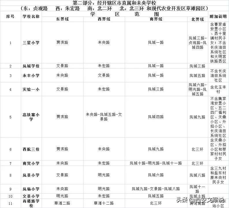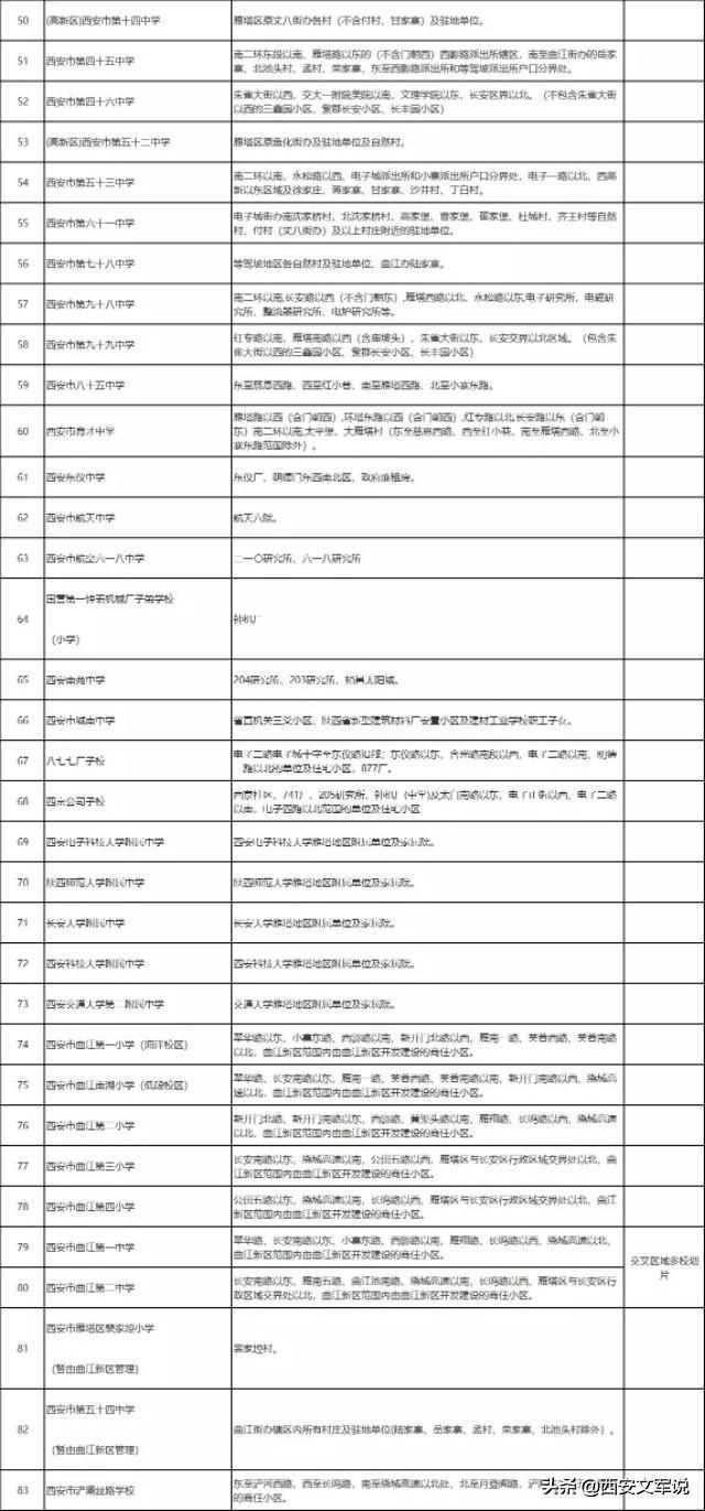 注:以上各学校学区范围是基本描述,若个别区域内入学学生数超过学校容纳量,开发区管理的学校由开发区根据实际情况统筹协调安排,雁塔区管理的学校由雁塔区教育局根据实际情况统筹协调安排。