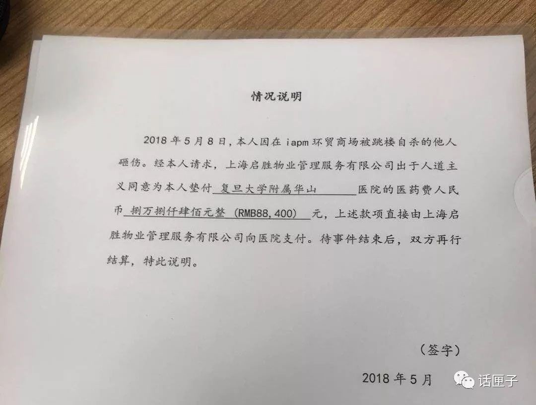 这份以伤者口吻拟定的“情况说明”写道:“本人”因被自杀的他人砸伤,经“本人”请求,上海启胜物业管理服务有限公司,出于人道主义同意为“本人”垫付。