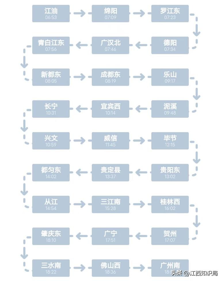 其中,列车在成都东站停靠12分钟,长宁站停靠12分钟,兴文站停靠23分钟,从江站停靠16分钟,进行待避。