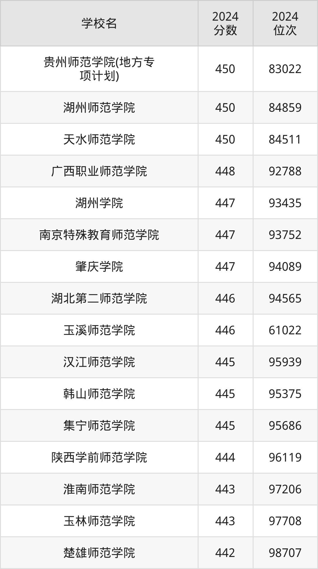 温馨提示:全国各省录取分数线不相同,本文以贵州省为例,为大家带来2024年录取分数线位于410到450分的二本师范大学名单汇总,并附上该分数段对应的位次排名区间,供查阅。