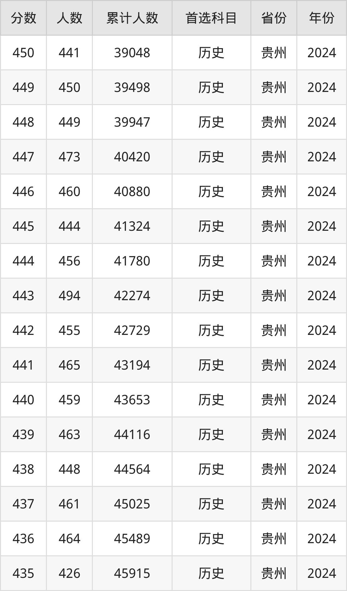 历史类410到450分的位次排名:38608名~57370名