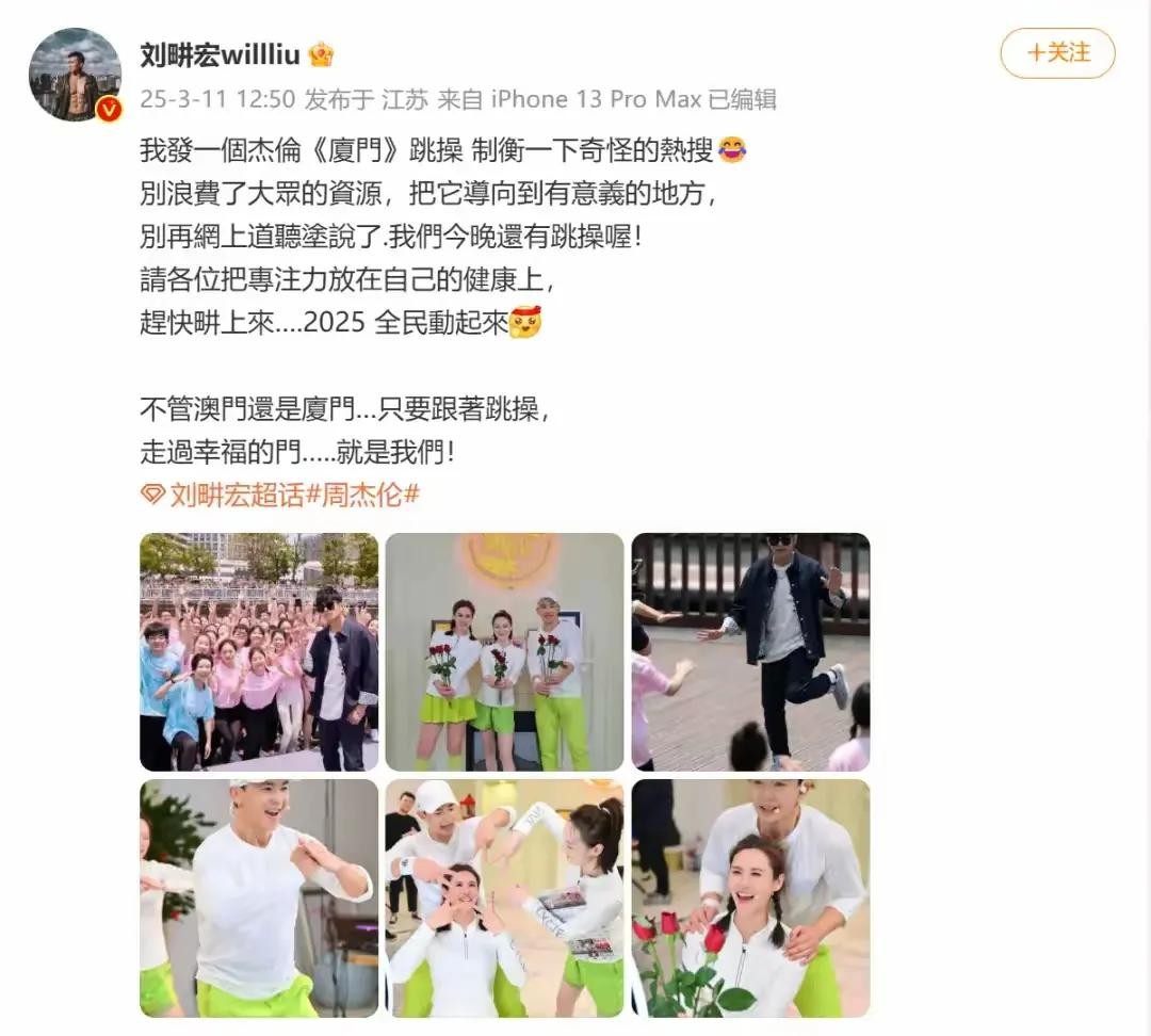 而周杰伦的好友刘畊宏呢,也是相当讲义气。他在微博上晒出了周杰伦在厦门跳操的照片,还配文说:“我发一个杰伦在厦门跳操的照片,制衡一下奇怪的热搜。”这一下子,大家伙儿都乐了,原来咱们的周董还在忙着健身呢,哪有时间去豪赌啊!
