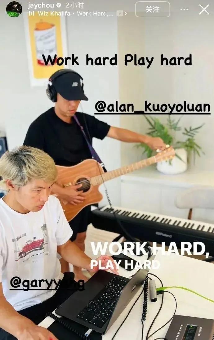 而周杰伦也在社交平台上传了在录音室比耶的照片。