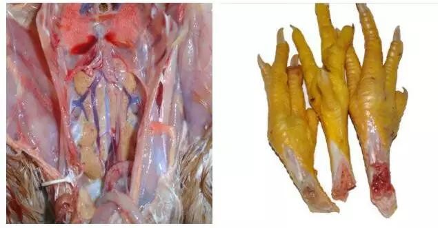 通过大量临床解剖,病鸡心脏周围积有30毫升左右的积液,有清亮的,有果冻状,心肌柔软,肝脏肿胀,肾脏肿大,发病严重的鸡肺脏淤血,坏死。肾脏黄染,骨髓黄染。