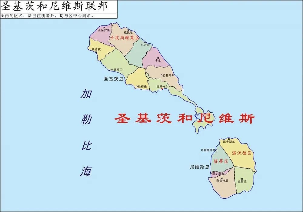 圣基茨和尼维斯联邦,是由圣克里斯多福岛与尼维斯岛所组成的岛国。国土面积267平方公里,圣基茨和尼维斯全国划分为15个区,其中圣基茨岛10个区,尼维斯岛5个区,首都是巴斯特尔。截至2021年,圣基茨和尼维斯国家人口5.8万。 1493年,达圣基茨岛和尼维斯岛在哥伦布的第二次航海中被发现。1624年,圣基茨和尼维斯有了首批欧洲殖民者前来。1628年,尼维斯岛沦为英国殖民地。1783年,根据《凡尔赛条约》,该岛正式划归英国。1983年9月19日,圣基茨和尼维斯独立,定国名为圣基茨和尼维斯联邦,为英联邦成员国。