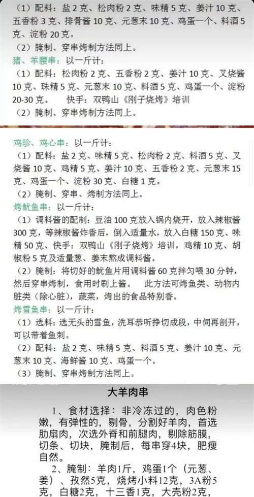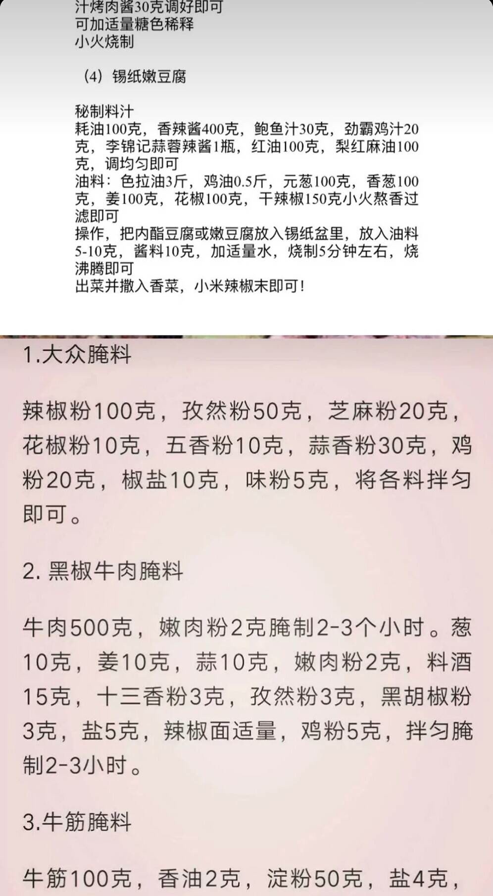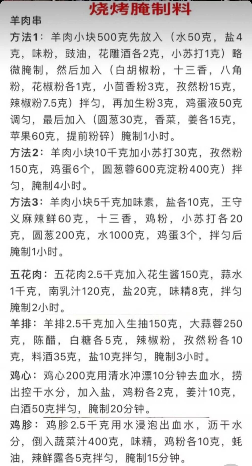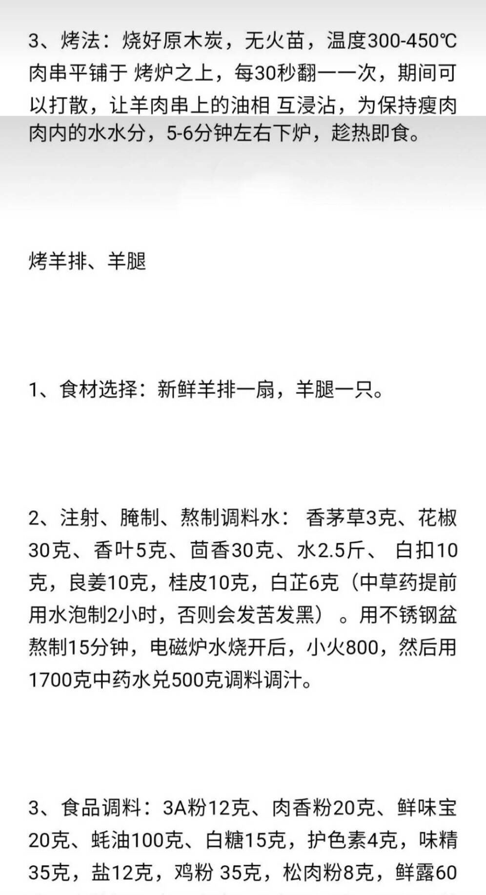 今天给大家分享的是非常多的烧烤的技术,因为夏天要到了嘛,想着大家在夏天的时候呢肯定会找一些烧烤的技术像锡纸类的呀,烤羊肉串儿啊,大肉串儿啊,烤羊腿,羊排呀,像这些技术大家肯定会去找,今天把这些技术免费的给大家分享出来。这些配方的味道呢都是很不错的,都是实体店实战的技术。