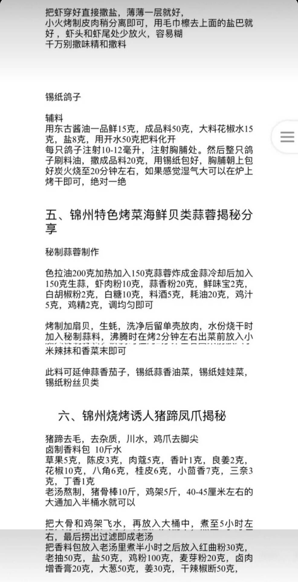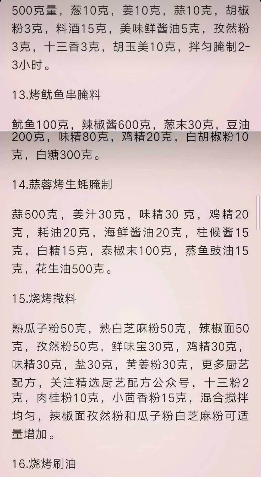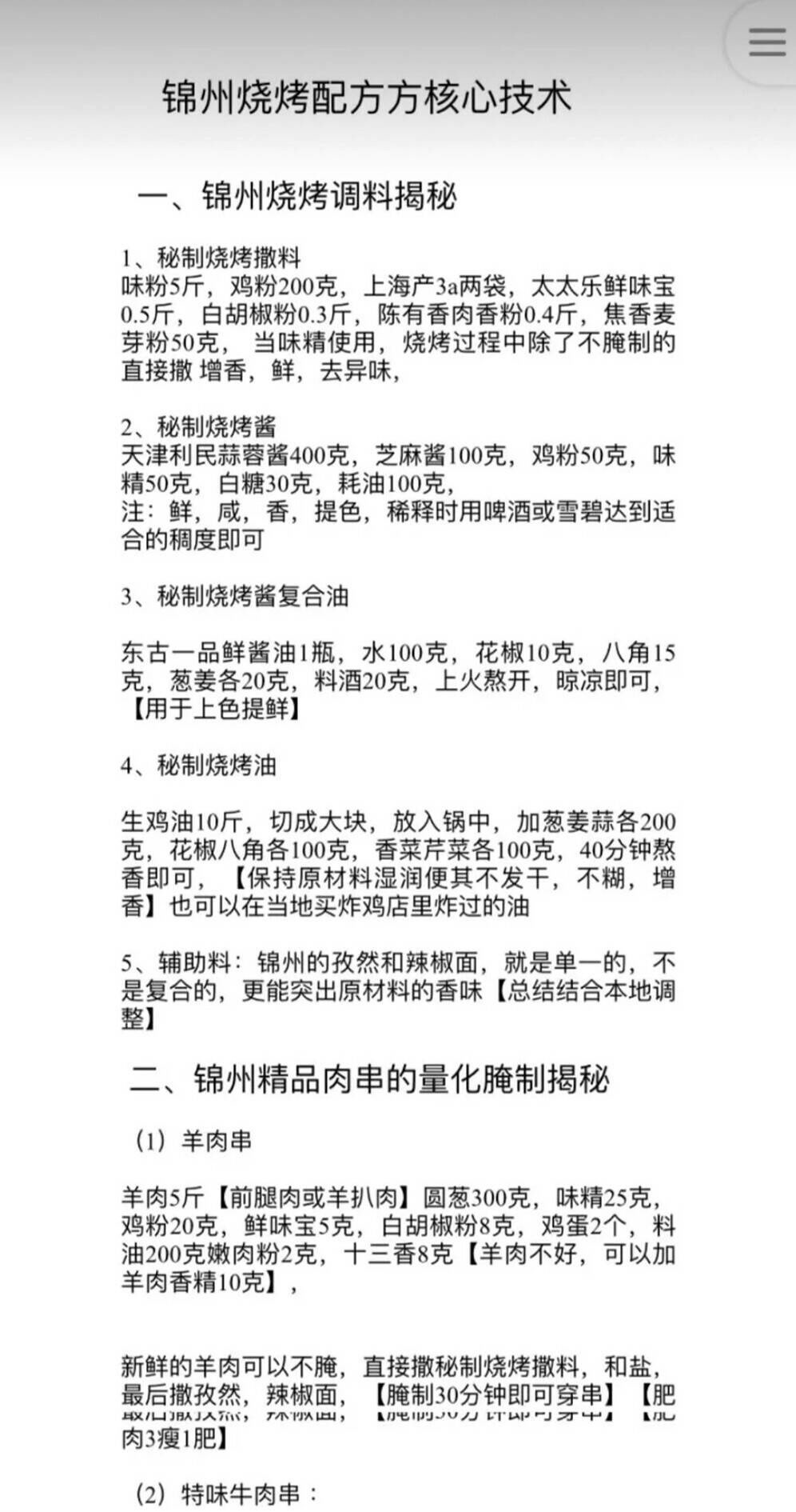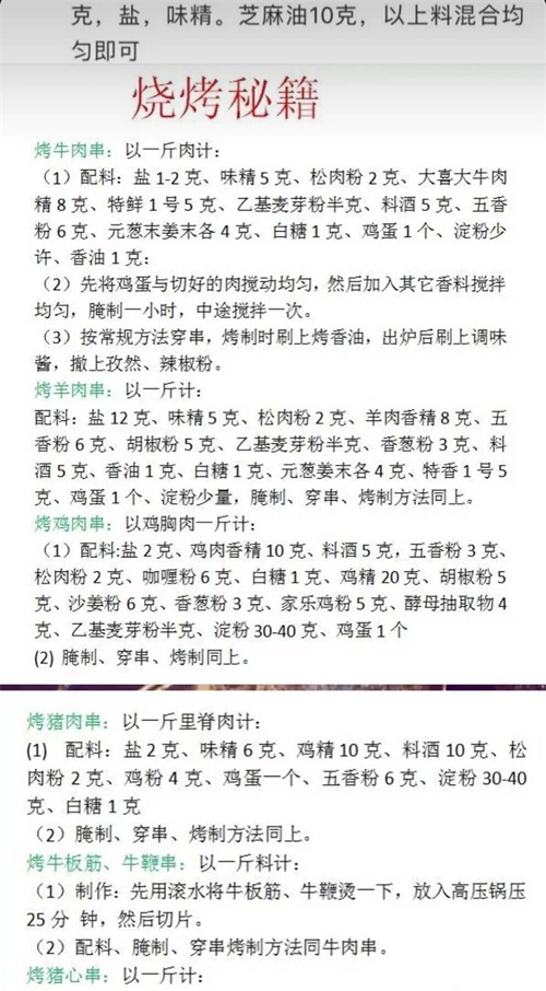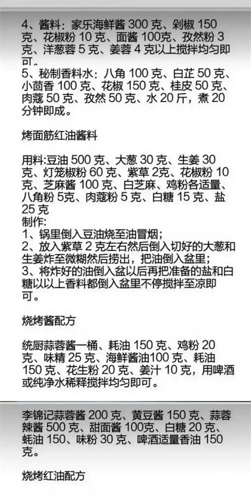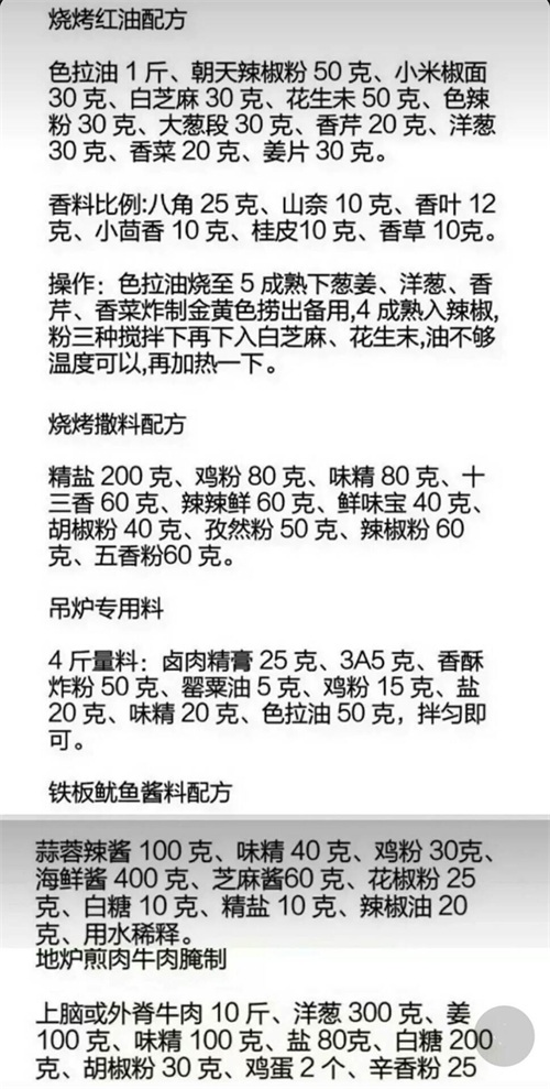 像一些烧烤料,你只需要按照配比去把对应的料买回来,按照比例去配就可以了,就能得到非常好的味道。那香一些酱料,蒜蓉酱,你按照做法去熬制就可以了。说到底,这些配方呢?这些烧烤店的老板根据当地的特色,自己店里面的口味去进行改良的。所以说你拿到这个配方以后也不要太过于高兴。