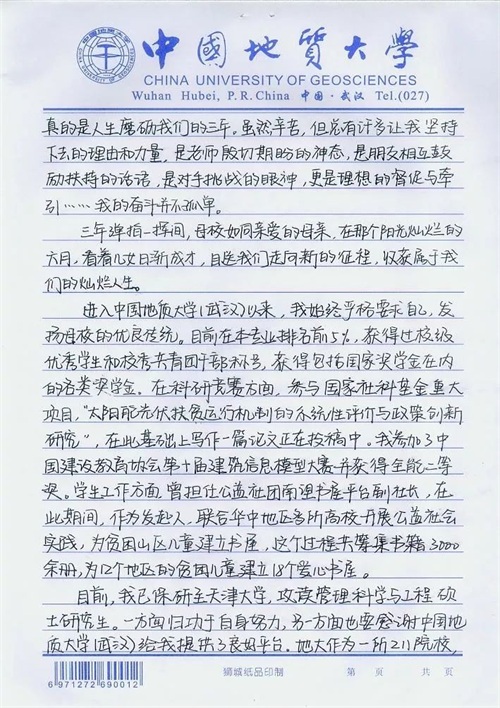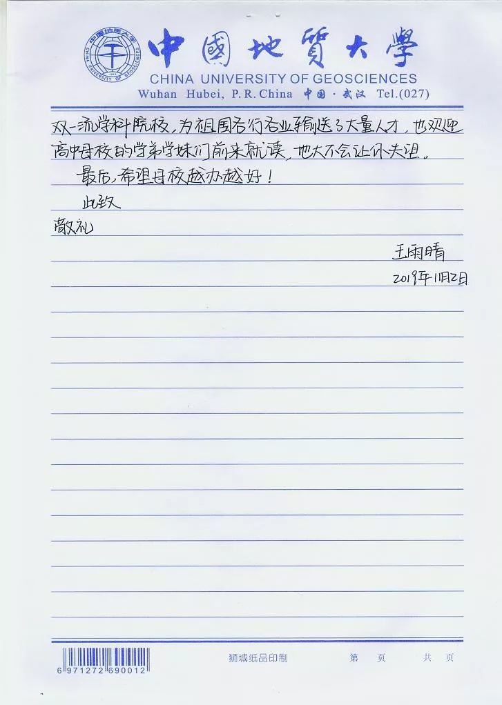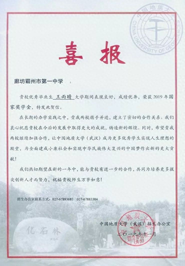 近日,中国地质大学(武汉)给霸州一中发来喜报,优秀毕业生王雨晴在大学期间表现良好,成绩优异,荣获2019年国家奖学金。