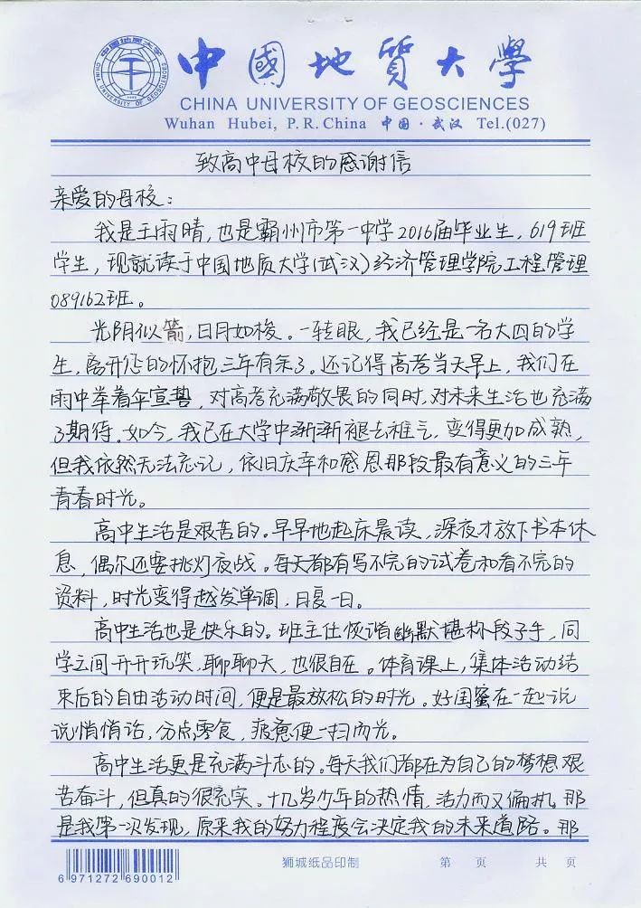 为感谢母校霸州一中的培养,她给母校寄来感谢信。