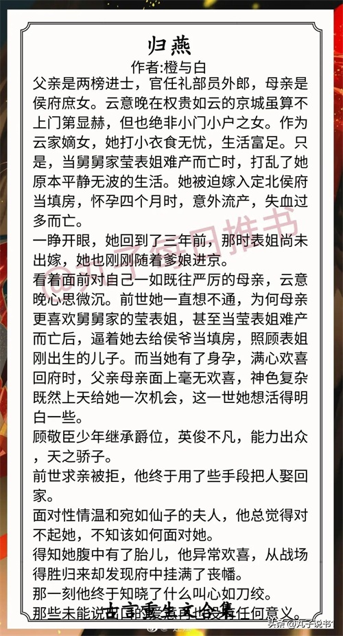 3.《归燕》作者:橙与白(温婉娴静嫡女vs隐忍深情侯爷,女主重生,复仇虐渣,宅斗权谋文)