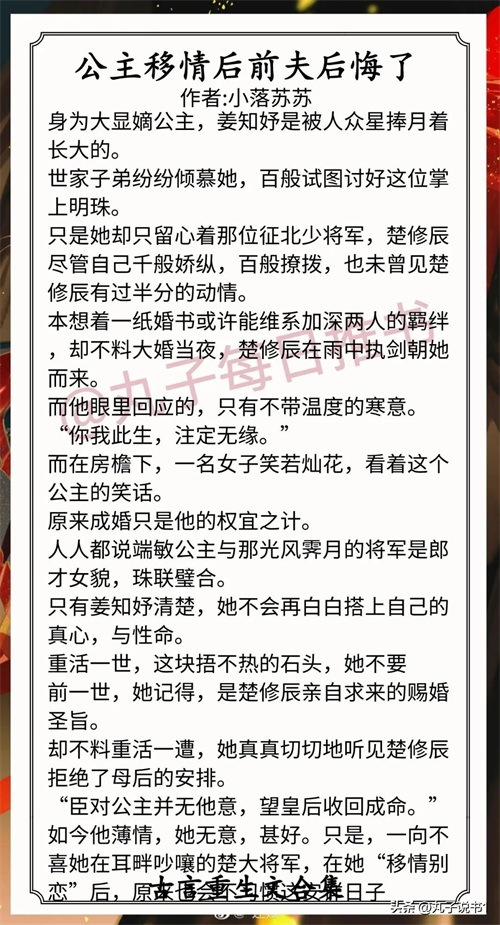 6.《公主移情后前夫后悔了》作者:小落苏苏(洒脱貌美公主vs隐忍少年将军,双重生,追妻火葬场)