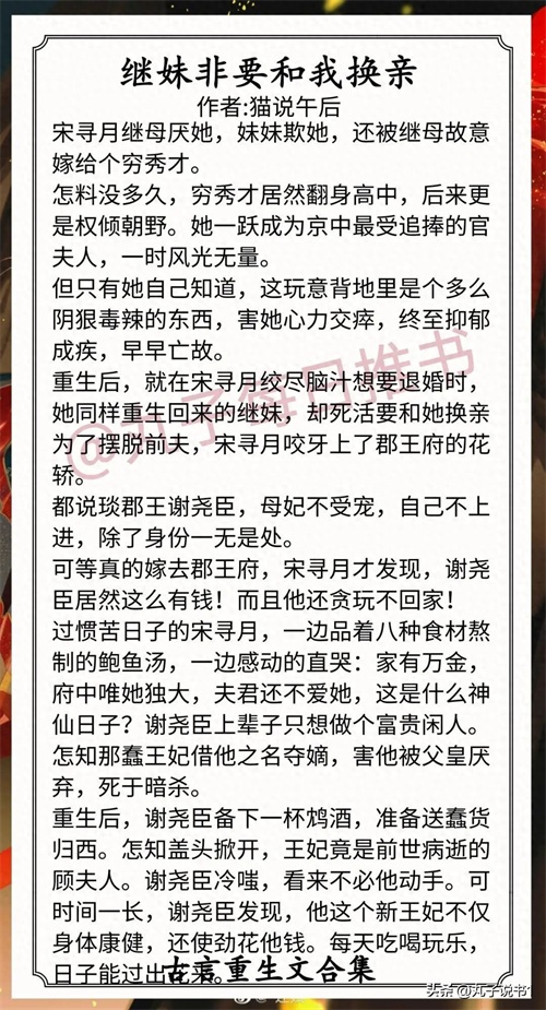 1.《继妹非要和我换亲》作者:猫说午后(咸鱼嫡女vs富贵郡王,双重生,先婚后爱,古言甜宠文)