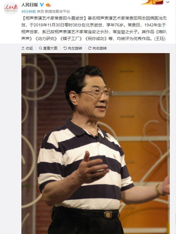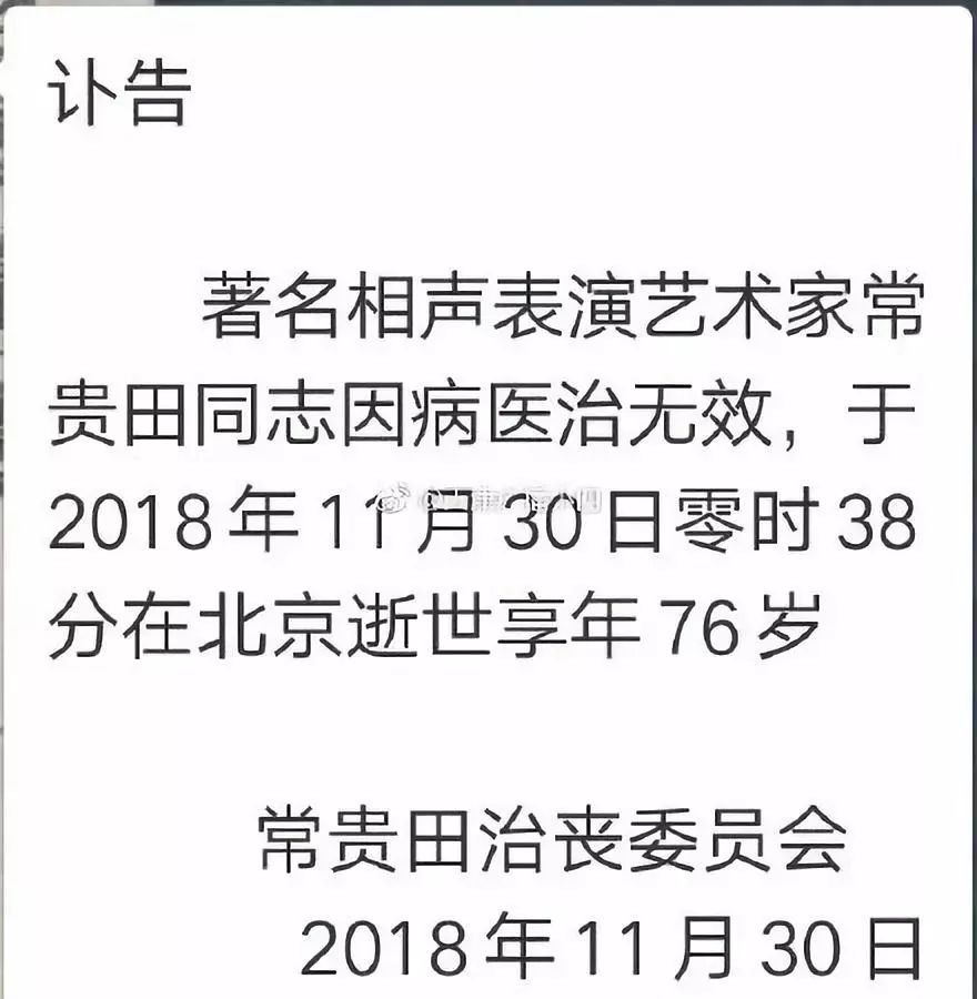 @人民日报 微博消息,著名相声表演艺术家常贵田同志因病医治无效,于2018年11月30日零时38分在北京逝世,享年76岁。