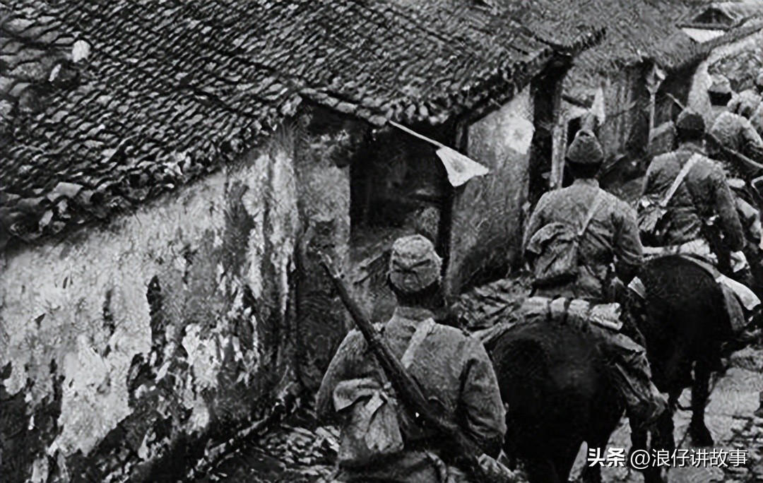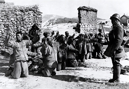 12.占领了我军的一个村庄,这些日军爬到了房屋顶上手舞足蹈。