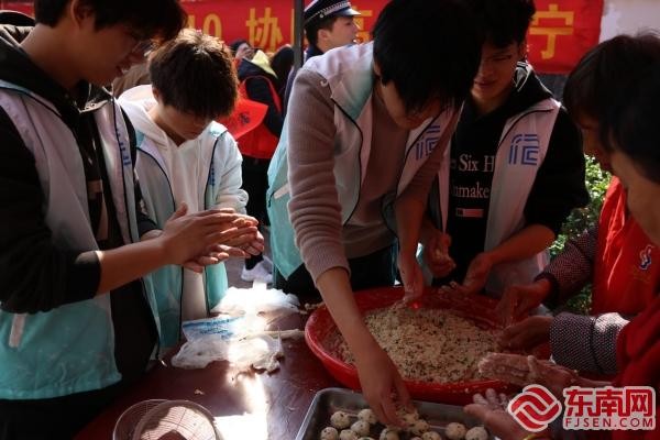 志愿者向村民学做莆田传统特色小吃“豆丸”。