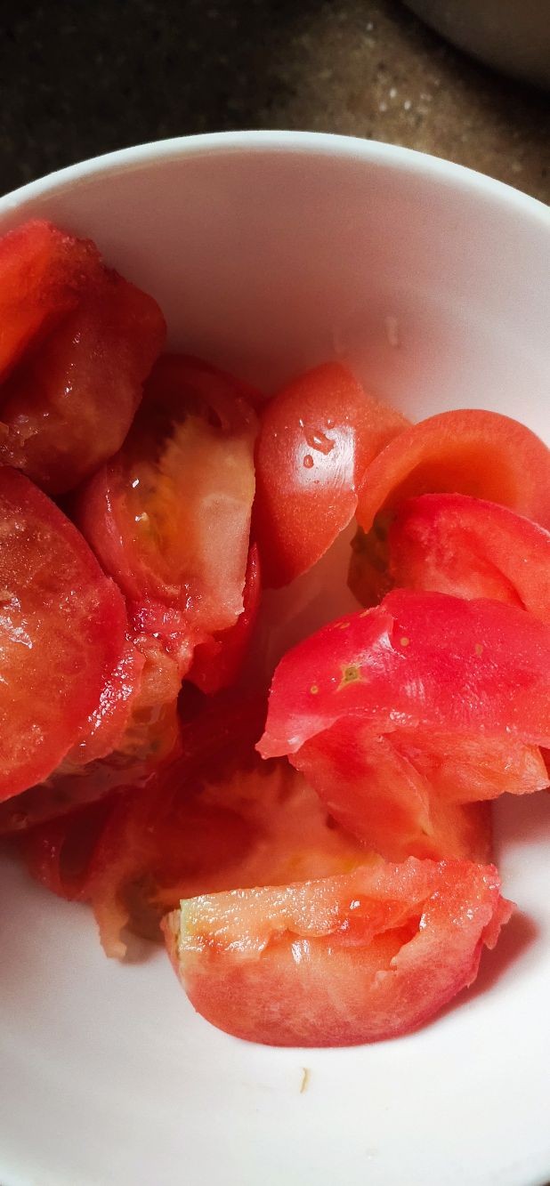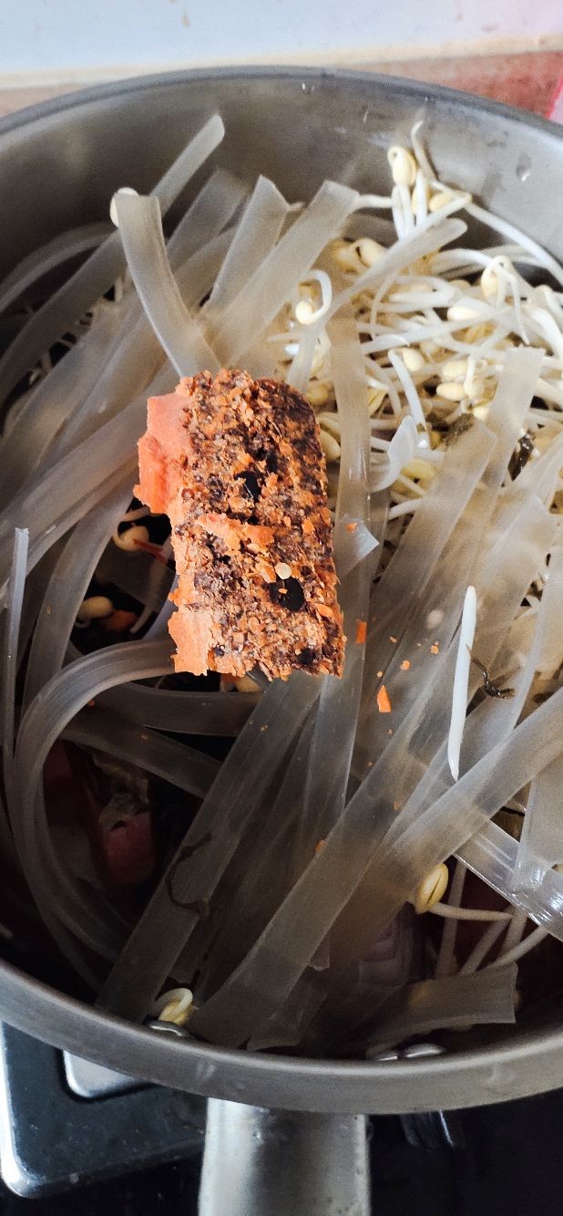 8.把西红柿.洋葱.咸菜.豆芽.一小把泡好的宽粉条,一起放到锅里,切一块火锅底料放到锅里。