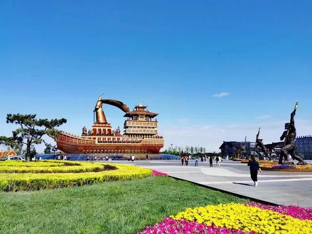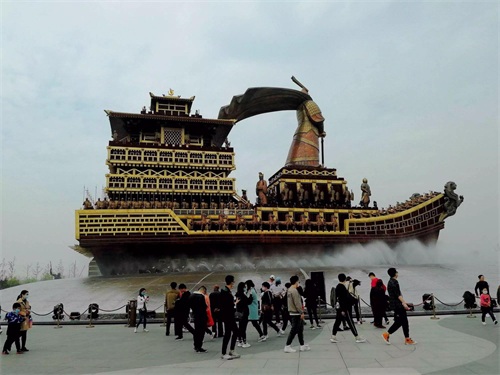当你走进公园时,首先映入眼前的景点就是一艘大木船,船头中央站立着汉武大帝,船舷旁排列着整齐的水兵队伍,显示着西汉强大的水兵军事力量。