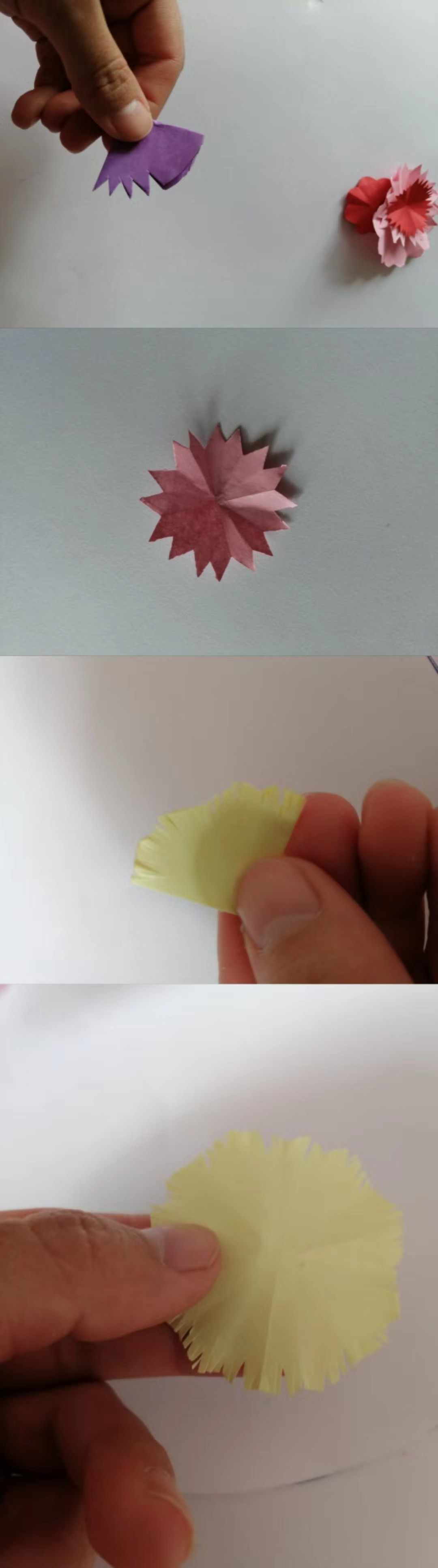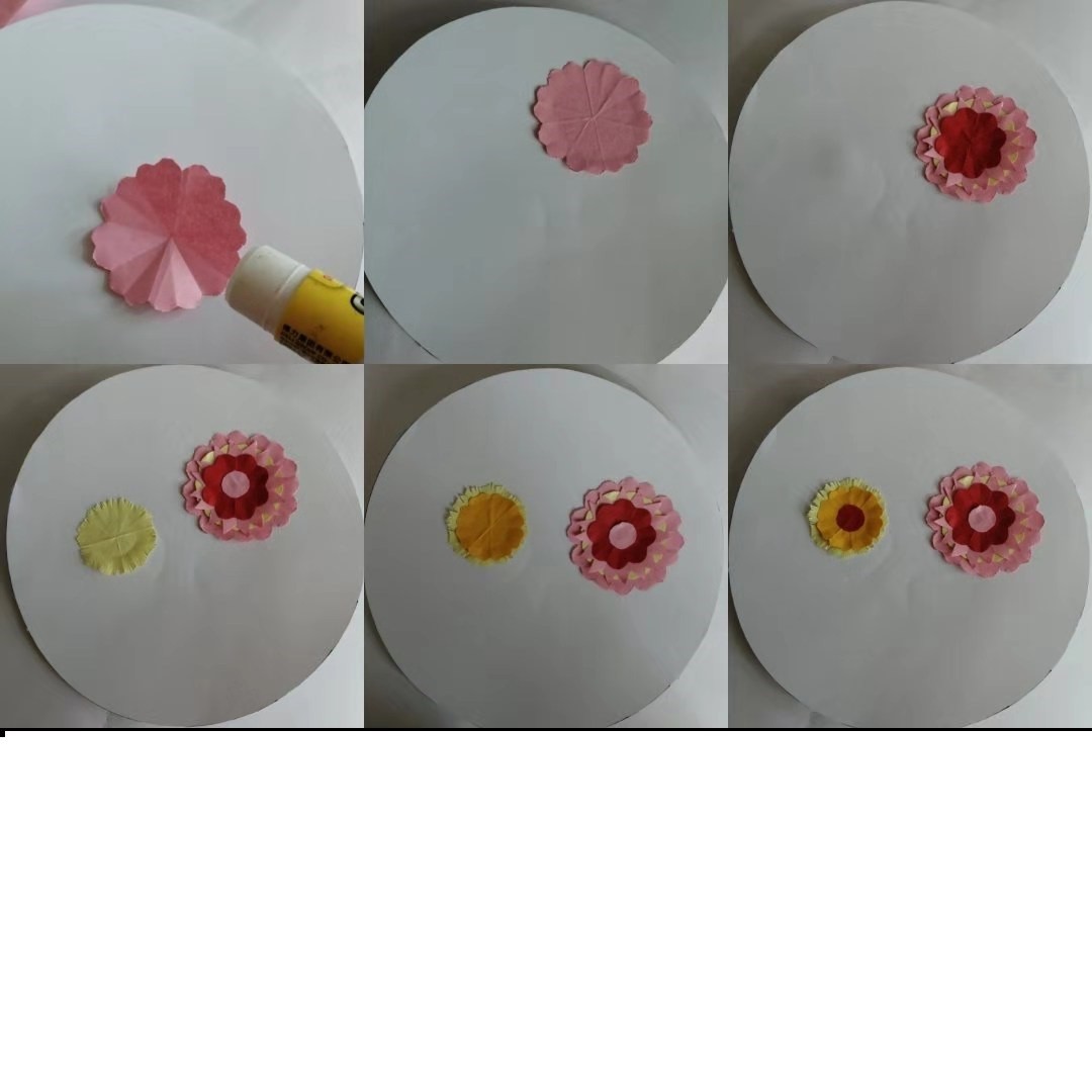 剪好之后开始粘贴。按照大小顺序粘贴,先粘最大的。最后再贴个小圆做花芯。