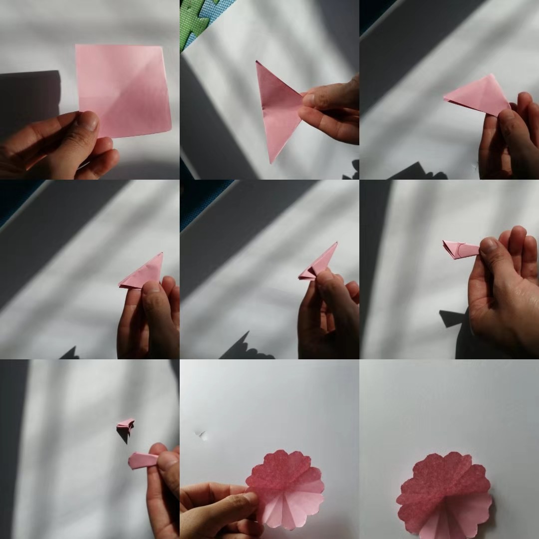 首先剪个彩色小正形,然后沿对角线折叠,再折,总共折四下。如下图,再沿弧线剪下来,打开之后就是一个圆花朵形状。