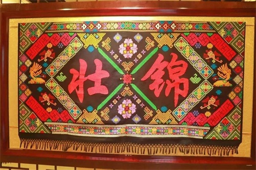 4.壮锦:是广西壮族自治区传统的著名丝织物。壮锦的花纹图案接近剪纸图案,变化千姿百态,花、鸟、鱼、虫、兽以及“万”字、“双喜”等文字图案,色彩以红、绿、黑、黄为主。