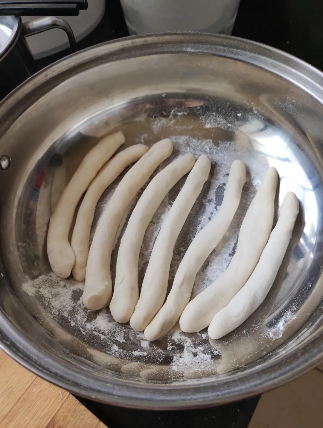 用手把面团分别搓成长条,放进洒了面粉的盆里。合上盖子等待几分钟。注意这一步不要让面条粘连在一起。