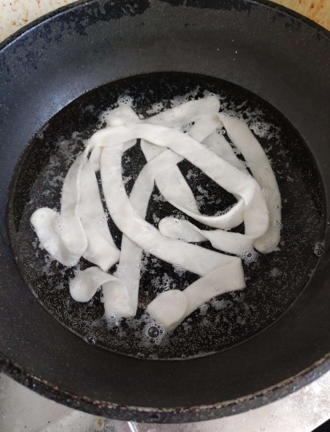 锅烧水,在水冒气泡的时候,拿起做好的面皮一根一根放进锅里。在放的时候,手提面皮俩端轻轻扯一扯,把面皮扯得更薄一点。