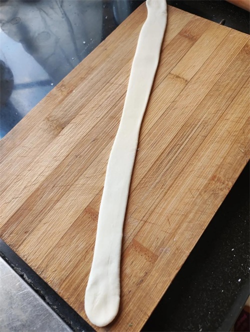拿出一根长条,放在案板上面,用擀面杖前后各擀一下,翻个面再各擀一下,一条面皮就擀好了。余下的面皮都是用相同的方法做好。