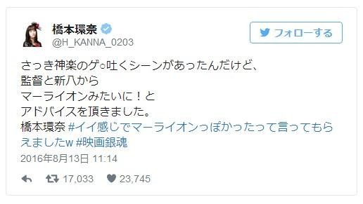 目前《银魂》的真人电影正在紧张拍摄中,出演神乐的桥本环奈也已入组开始了拍摄工作,8月13日,桥本环奈发表推文称:“刚才我拍摄了神乐呕吐的情节,导演和新八(菅田将晖)建议我要像鱼尾狮那样吐。”同时她还带上一个名叫“他们对我说像鱼尾狮那样就对了”的标签。