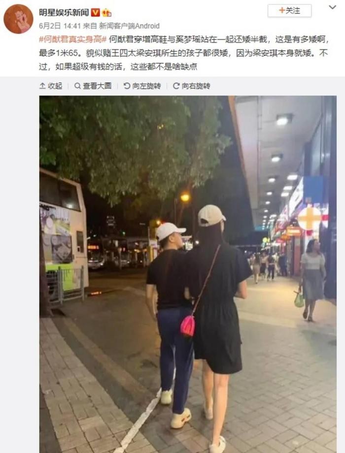 有网友表示何猷君穿了增高的球鞋,但是站在奚梦瑶身边的时候,还是矮了半截,看上去身高顶多只有165cm。因为奚梦瑶的官方身高是178cm,就算是穿着平底鞋也应该有180cm左右。但是何猷君的鞋底最起码有5cm,但是看上去还是比奚梦瑶矮10cm。