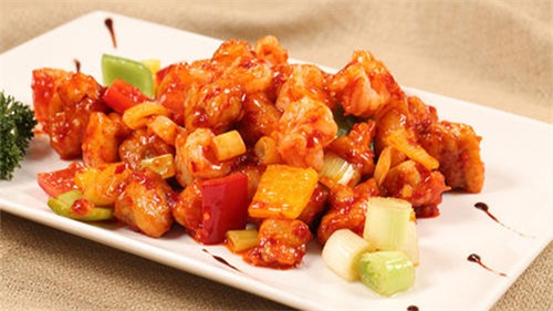 2、坐锅点火倒油,放入鸡丁、虾仁滑炒至熟取出,留底油,放入青红椒、白果、鸡丁、虾仁,倒入调好的汁,快速翻炒,淋少许醋出锅即可。