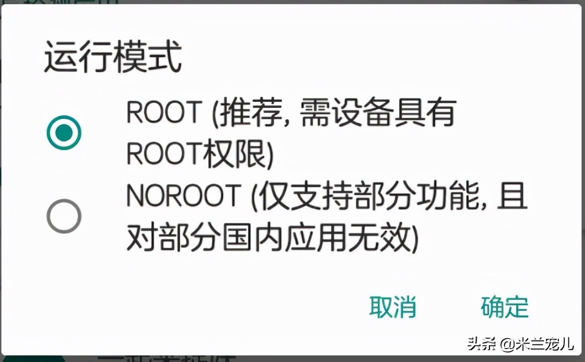 3、这时候会跳出一个选择框。根据手机权限来选择,root模式就直接点击授权就行了。